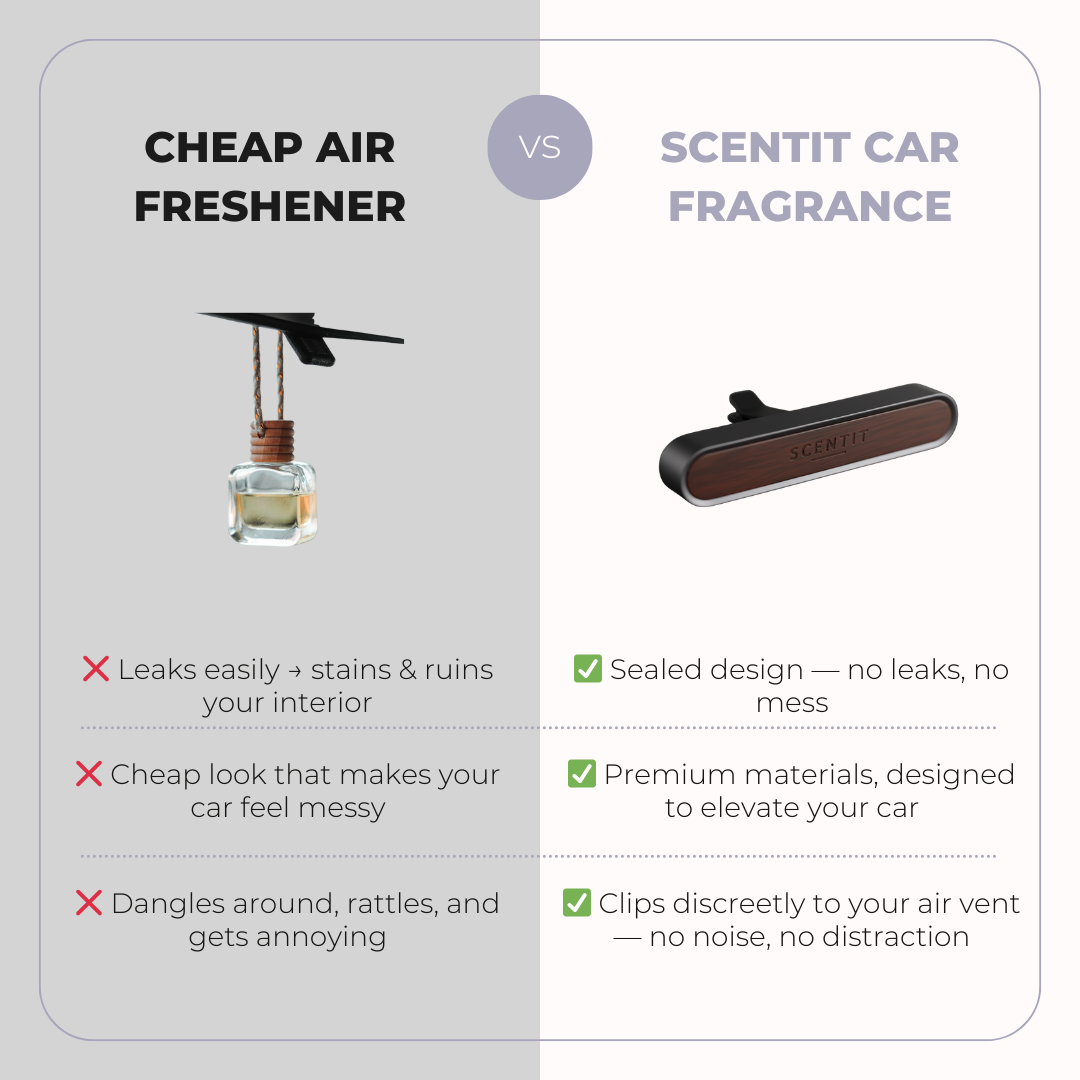 Unlike cheap air fresheners, Scentit contains no harsh chemicals, aerosols, or synthetic solvents that can cause headaches or damage your interior.